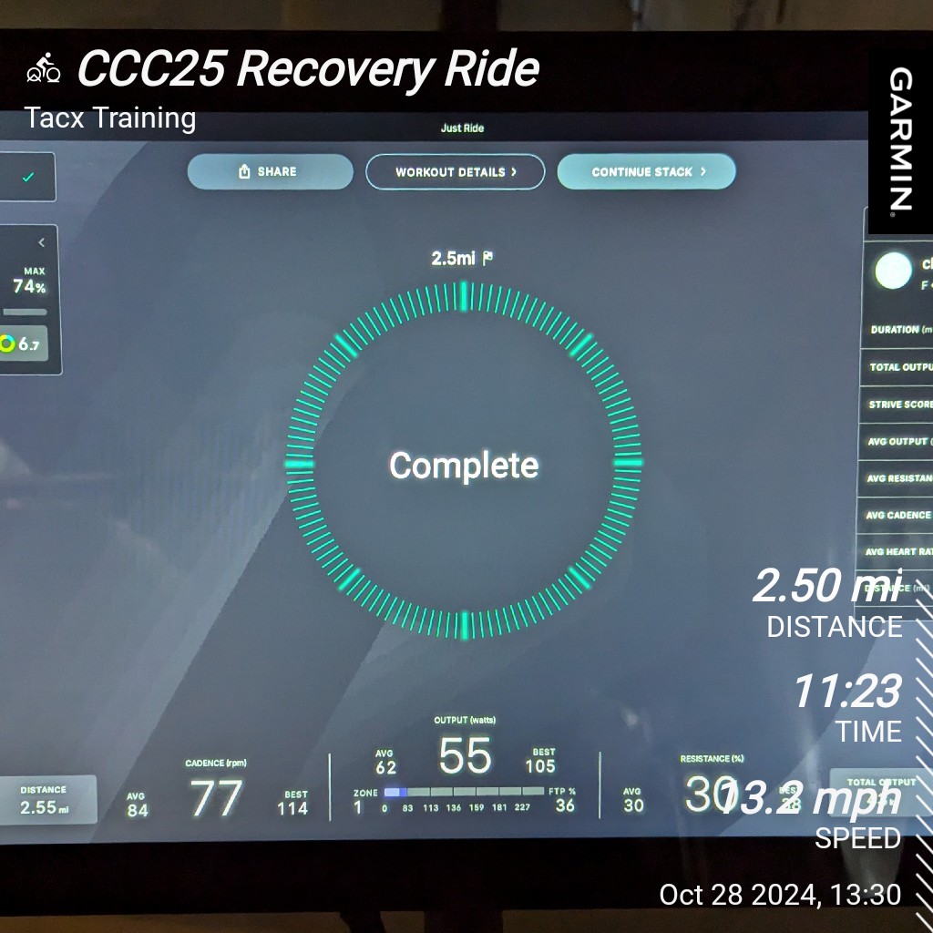 2.5 miles of recovery to do and a busy day with some unexpected morning errands means hopping on the Peloton and slamming out some quick miles at lunch. Love that I can just tell the bike how far I want to ride and away we go.